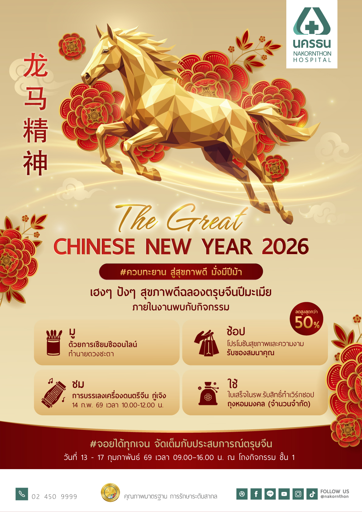 โรงพยาบาลนครธน จะจัดกิจกรรมฉลองตรุษจีน The Great Chinese New Year 2026 ในวันที่ 13 - 17 กุมภาพันธ์ 2569 เวลา 09.00-16.00 น. ณ โถงกิจกรรม ชั้น 1 จึงขอเชิญชวนทุกท่าน มาร่วมกิจกรรวมในวันดังกล่าว "เฮงๆ ปังๆ สุขภาพดีฉลองตรุษจีนปีมะเมีย" ไปพร้อมกัน โดยภายในงาน เตรียมพบกับกิจกรรม "มู-ช้อป-ชม-ใช้"
