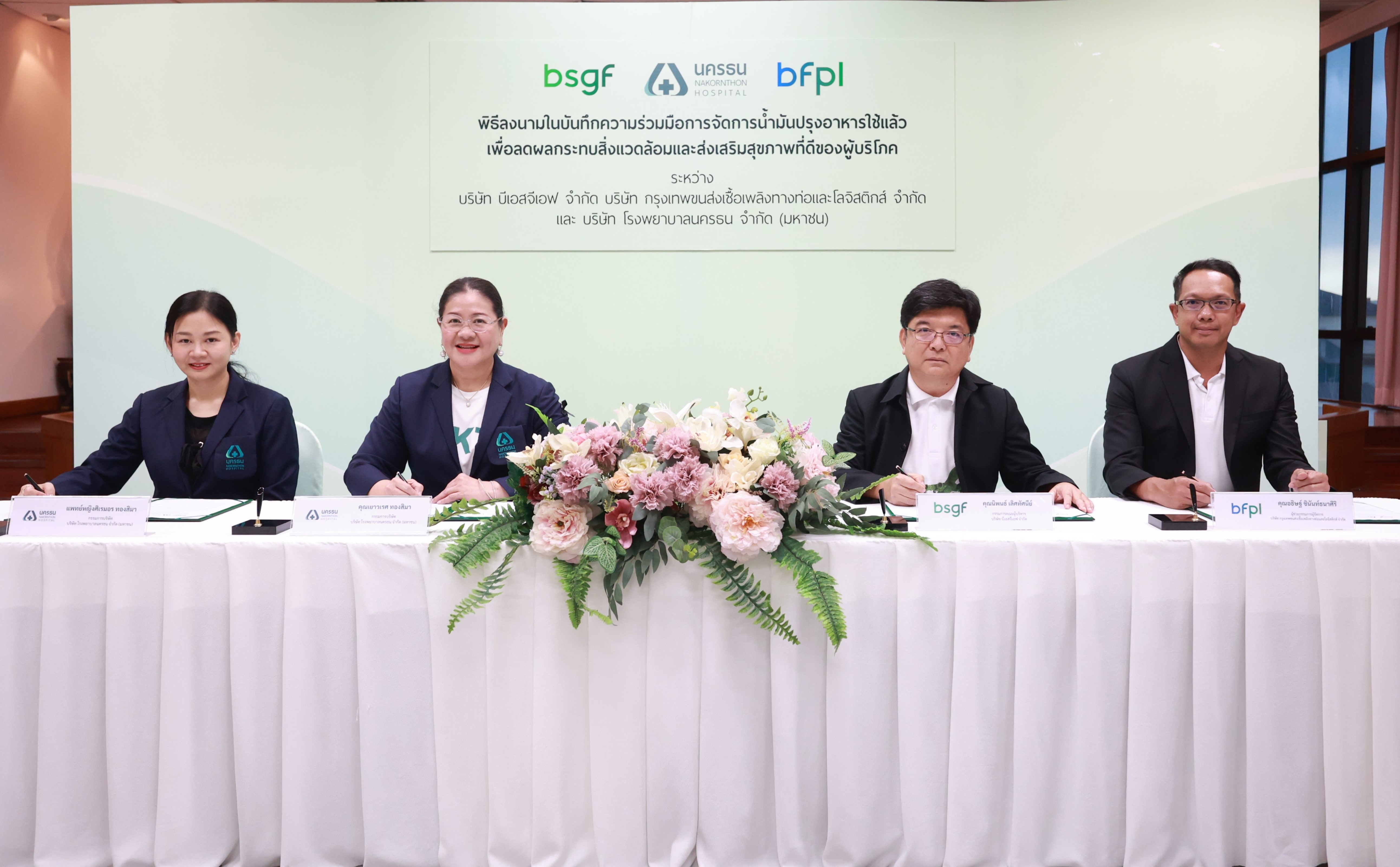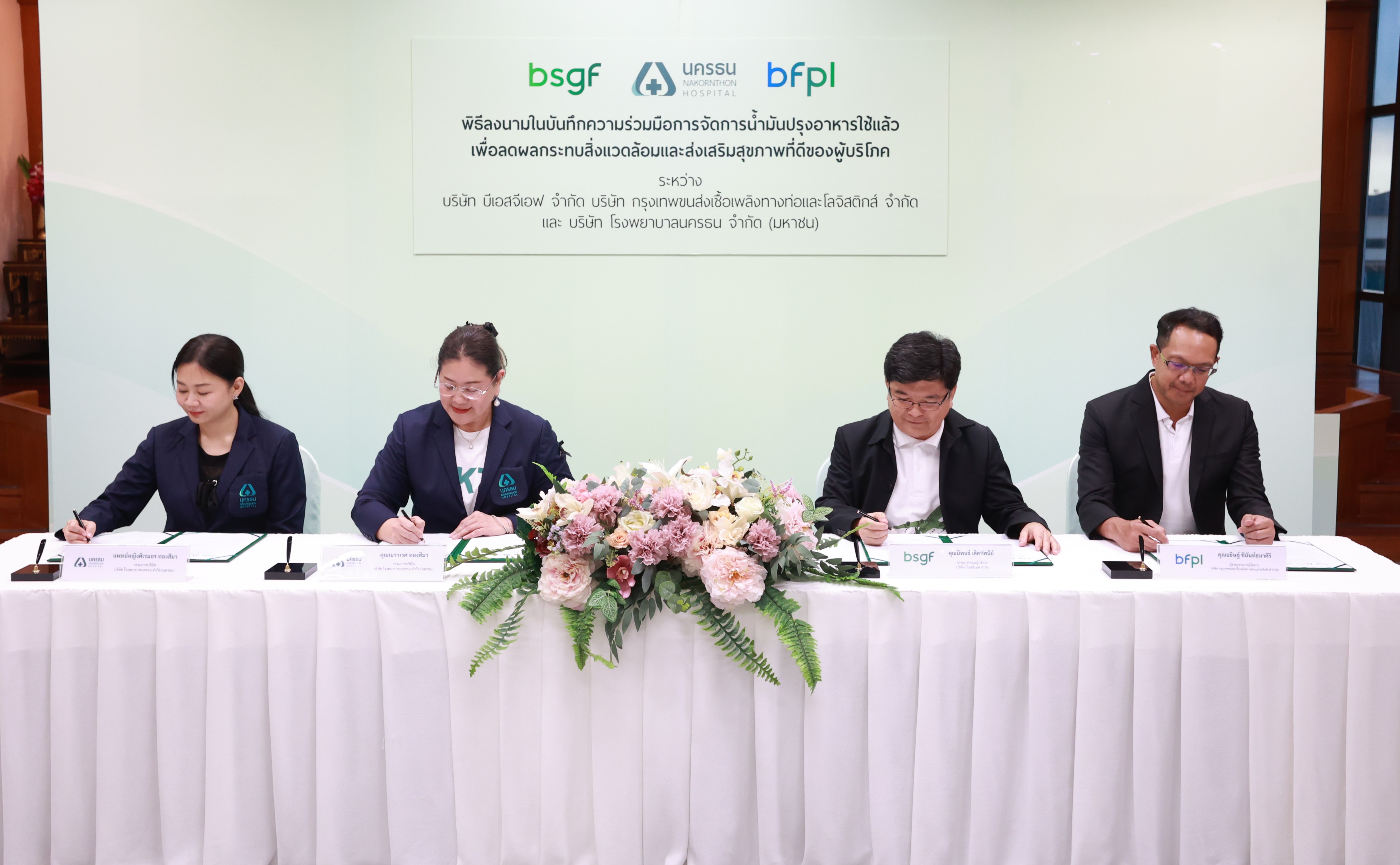 บริษัท โรงพยาบาลนครธน จำกัด (มหาชน) ร่วมกับ บริษัท บีเอสจีเอฟ จำกัด และบริษัท กรุงเทพขนส่งเชื้อเพลิงทางท่อและโลจิสติกส์ จำกัด ลงนามบันทึกความร่วมมือการจัดการน้ำมันปรุงอาหารใช้แล้ว เพื่อลดผลกระทบสิ่งแวดล้อมและส่งเสริมสุขภาพที่ดีของผู้บริโภค โดยมี คุณเยาวเรศ ทองสิมา ผู้อำนวยการสายงานบริหาร และพญ.ศิเรมอร ทองสิมา ผู้อำนวยการสายงานแพทย์ ให้เกียรติลงนามร่วมกับ คุณนิพนธ์ เลิศทัศนีย์ กรรมการคณะผู้บริหาร บริษัท บีเอสจีเอฟ จำกัด และคุณอธิษฐ์ ชินันท์ธนาศิริ ผู้ช่วยกรรมการผู้จัดการ สายงานคลังน้ำมันและระบบส่งทางรถยนต์ บริษัท กรุงเทพขนส่งเชื้อเพลิงทางท่อและโลจิสติกส์ จำกัด พร้อมกันนี้ คุณสมเพ็ญ ทองสิมา ที่ปรึกษาด้านการลงทุน สังคม สิ่งแวดล้อม และธรรมาภิบาล ได้ร่วมกล่าวถึงความร่วมกันในครั้งนี้
