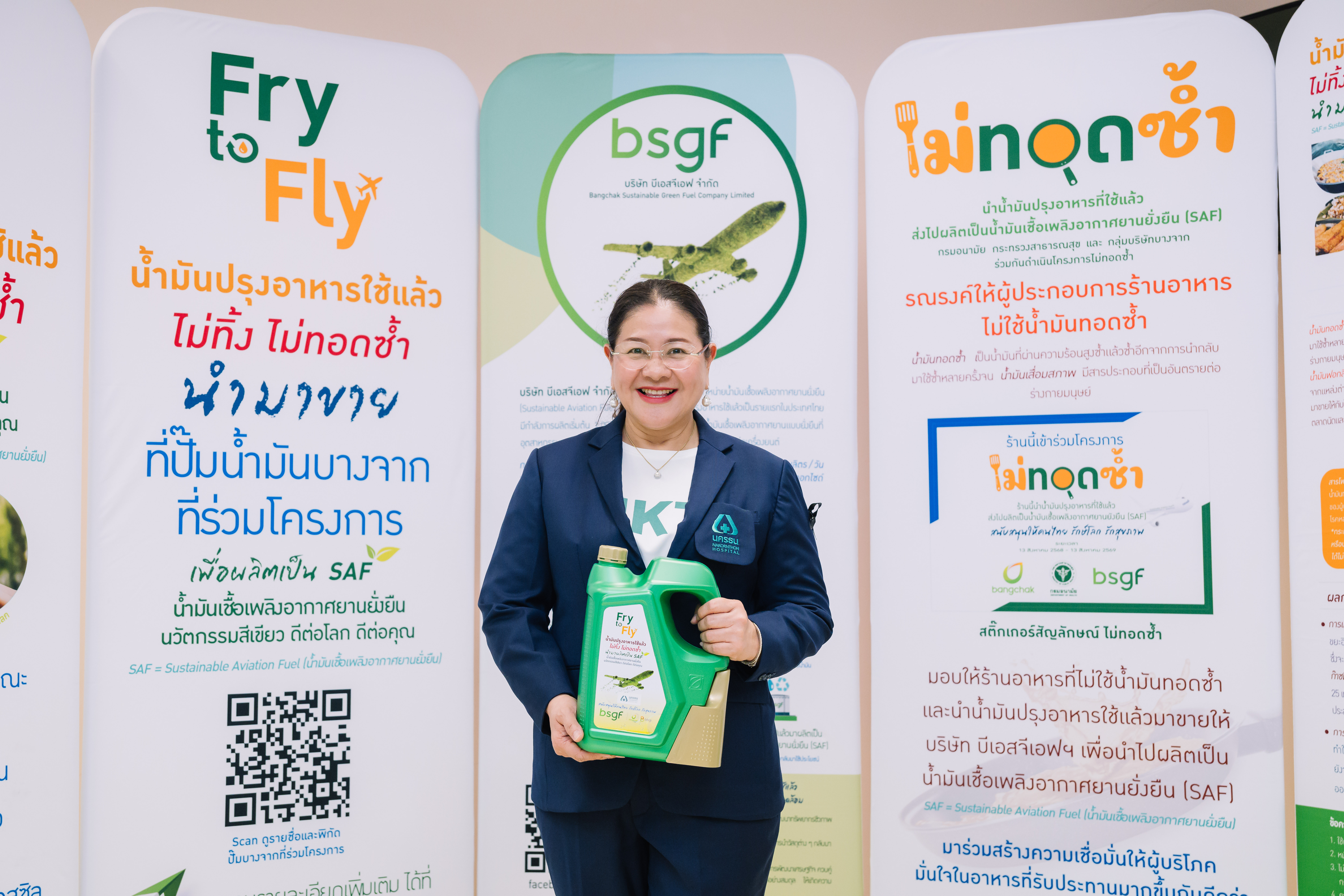 บริษัท บีเอสจีเอฟฯ ดำเนินธุรกิจด้านการพัฒนาและผลิตน้ำมันเชื้อเพลิงอากาศยานยั่งยืน หรือ SAF (ซาฟ) จากน้ำมันปรุงอาหารใช้แล้ว ซึ่งเป็นการนำของเสียมาเพิ่มมูลค่า ช่วยลดการปล่อยก๊าซเรือนกระจก และเป็นหนึ่งในแนวทางการรับมือกับภาวะโลกร้อน ผ่านโครงการ “Fry to Fly” ซึ่งเป็นอีกหนึ่งตัวอย่างของแนวคิดเศรษฐกิจหมุนเวียนที่เปลี่ยนของเสียจากกระบวนการปรุงอาหารอย่างน้ำมันใช้แล้วให้กลับมาเป็นพลังงานสะอาด โดยไม่ต้องผ่านกระบวนการกำจัดที่อาจส่งผลกระทบต่อสิ่งแวดล้อมและชุมชน